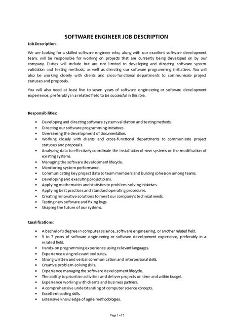 Software Engineers Job Description - The job duties and responsibilities of software engineers include: Find out the key skills, responsibilities, and requirements for this role and how to tailor. Learn how to write a resume that matches the software engineer job description. Learn what a software engineer does, how to write a job description, and what skills and qualifications to look for. First, they are.
